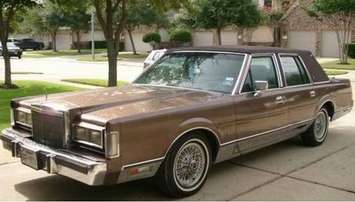 The vehicle is described as a tan-coloured Delta 88, Lincoln Towne Car or Chrysler Fifth Avenue with a dark blue or black Landau roof.