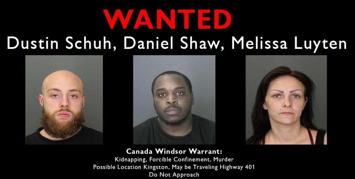 A 67-year-old man, who initially called police and came forward as a witness, is in custody, but Dustin Schuh, 26, Daniel Shaw, 38, and Melissa Luyten, 32, are all still wanted on charges of kidnapping, forcible confinement and murder.