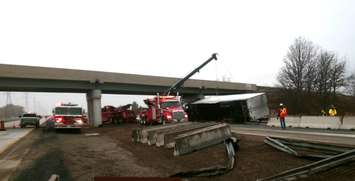 BlackburnNews.com file photo of the aftermath of a collision involving two tractor-trailers on the 401 at Queen's Line.