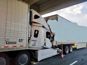 The Ontario Provincial Police said the collision occurred shortly before 6 p.m. on Friday, after a tractor trailer collided with the rear of another tractor trailer in the eastbound lanes at Iona Road.