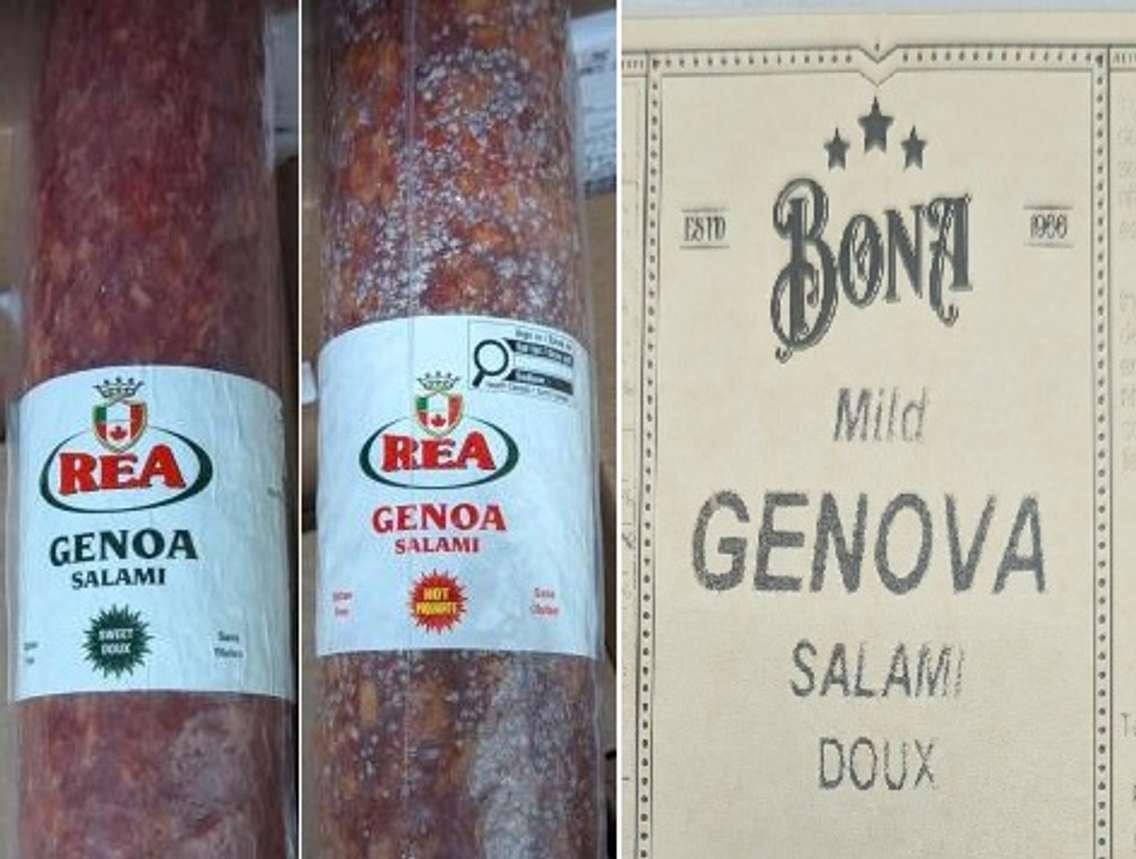 The recall in Ontario, Alberta, and Manitoba is for Rea brand Genoa Salami Sweet, Rea brand Genoa Salami Hot, and Bona brand Mild Genova Salami.