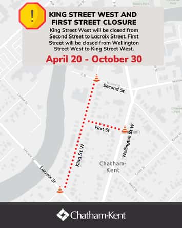 The municipality said King Steet West will be closed from 2nd Street to Lacroix Street until the end of October to continue the major road reconstruction that started last year. This next phase of the project includes replacing the remaining storm, sanitary, and water infrastructure along King Street West, said municipal officials.