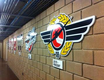 Windsor Spitfires' logos, past and present, in the hallway outside of the team's dressing room at the WFCU Centre. (Photo by Mike Vlasveld.)Windsor Spitfires' logos, past and present, in the hallway outside of the team's dressing room at the WFCU Centre. (Photo by Mike Vlasveld.)