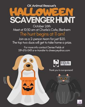 Join us for our second annual Halloween Scavenger Hunt fundraiser on October 26th! We'll be meeting at 10:30 am at Charlie’s Cafe in Blenheim with the hunt beginning at 11 am. Team up as a duo for just $20 and the top two teams win a prize!!