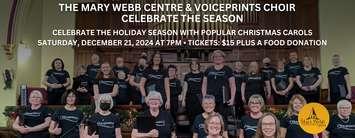 Sat., Dec. 21, 2024, the Mary Webb Centre for the Arts will be welcoming the Voiceprints Choir to help us celebrate the Christmas season with a special fundraising concert for our local Food Bank. This choir of 41 singers, a director and a keyboard accompanist will be performing two 45-minute sets filled with popular Christmas music and carols. Tickets are only $15 plus a donation of non-perishable food items or monetary donations for the local food bank. Doors open at 6 pm. Concert is at 7 pm. Tickets available at local vendors and at marywebbcentre.ca.