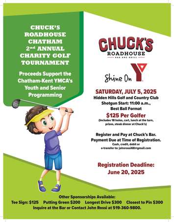 Be sure to register your foursome for the Chuck's Roadhouse 2nd Annual Charity Golf Tournament for the YMCA of Chatham-Kent. Proceeds to support youth and senior programs. Last year's event raised $7000. Saturday, July 5 at Hidden Hills Golf and Country Club. Hole and other sponsorships available too. All details on attached poster or in the restaurant.