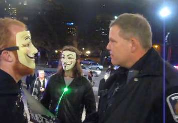 Officers were called to 300 Dufferin Ave. around 7pm last night as a crowd gathered on the front steps of city hall to protest social injustice, many of them wearing Guy Fawkes masks.