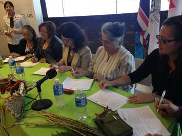 College president Patti France and aboriginal leaders, including Caldwell First Nation Chief Louise Hillier and Bernita Brigham-Jacobs of the Bkejwanong Territory on the Walpole Island First Nation, signed the document.