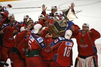All three Canadian teams were eliminated in the quarterfinals. Sting rookie Jordan Kyrou and Canada White finished 5th, Canada Red 6th, Canada Black 7th and Slovakia 8th.Russia celebrates after scoring what would prove to be the U-17 gold medal winning goal Nov. 8, 2014 at the RBC Centre. (BlackburnNews.com photo by Dave Dentinger)