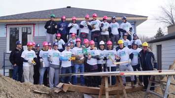 The Sarnia Sting helps with construction of Habitat for Humanity's latest build. December 2, 2014 (BlackburnNews.com photo by Jake Jeffrey)