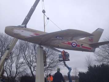 After 22 months of restoration, the iconic F-86 Sabre Golden Hawk has been carefully attached back to its perch at Sarnia's Germain Park.