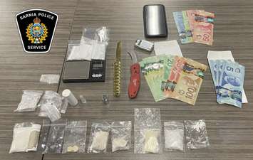 The Sarnia Police Service seized a large quantity of suspected illegal drugs and charged two people with trafficking after an arrest on Friday.