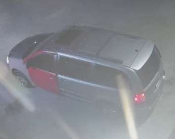 The vehicle is described as an older-model Chrysler minivan, silver or grey, with a red driver’s side door and sunroof. It may also have rear-end damage.